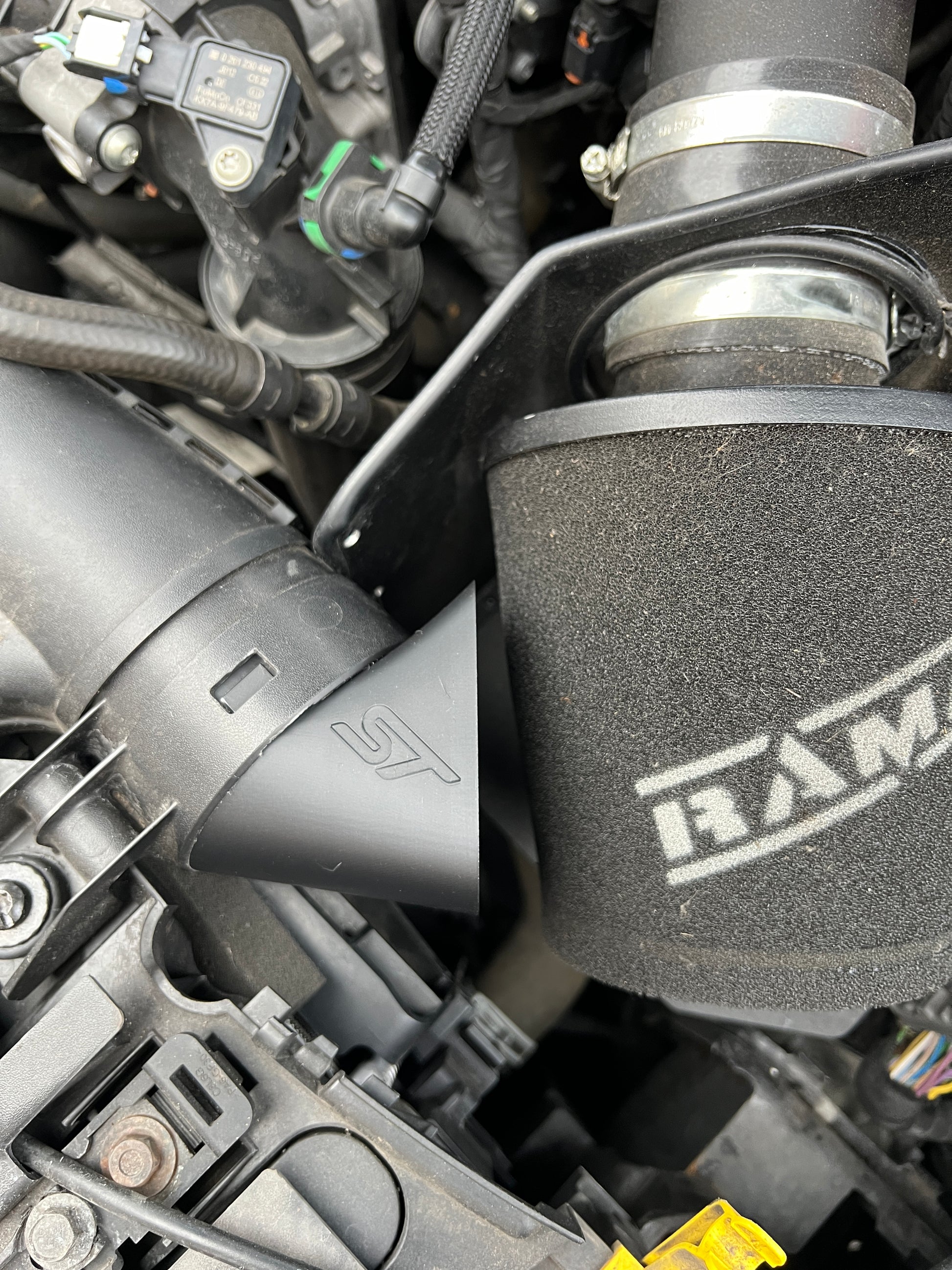 Our Air Intake duct helps to feed cool air to your Ramair filter by channelling high pressure air from the front of the car. The Ford Fiesta ST mk8 has a very well engineered cold air feed when using the standard air box, but unfortunately once the air box is replaced with a cone type filter the factory air feed struggles to direct air towards your filter and is more likely to take in hot restrictive air from in the engine bay. Our air intake duct redirects this air towards your filter.
